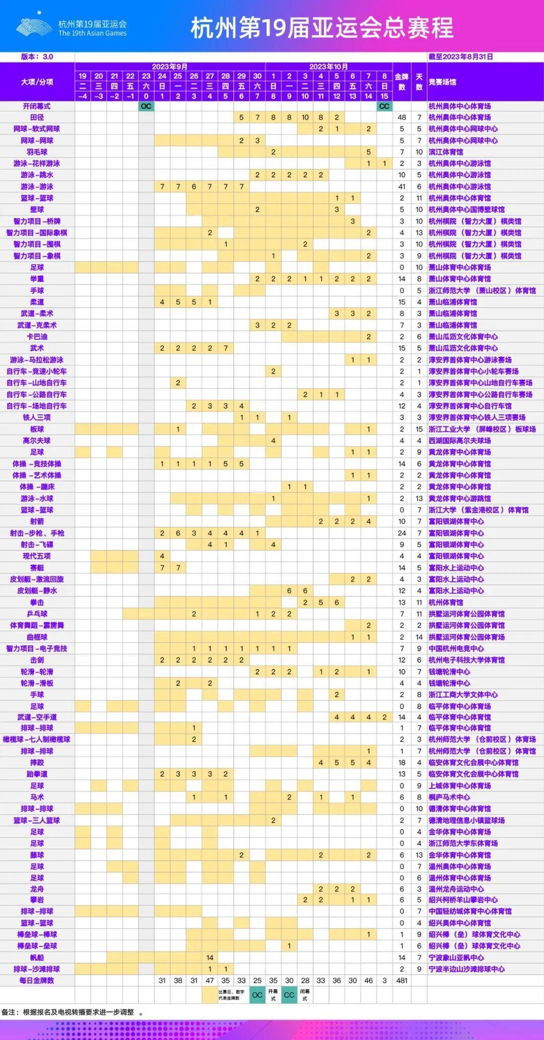 根据最新的报名调整情况和经过杭州亚运会各项目技术代表的确认,杭州亚运会的总赛程已经更新至3.0版,现在公布如下: