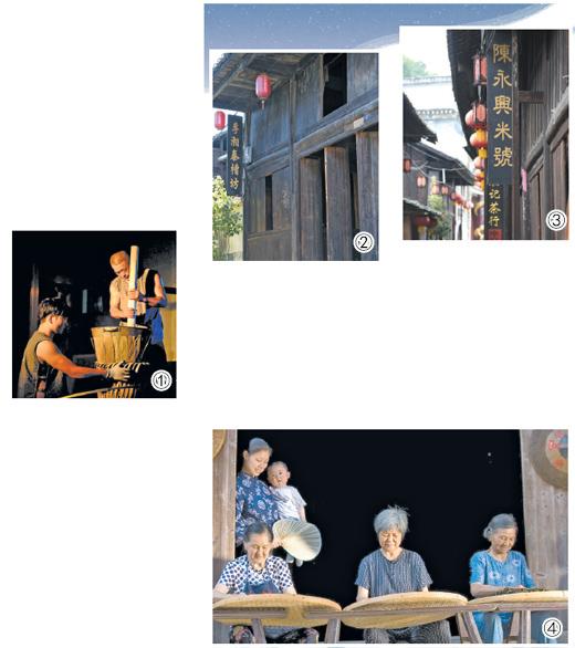 图④:唐家观古民居前,几位村民正在展示安化黑茶拣茶工艺。