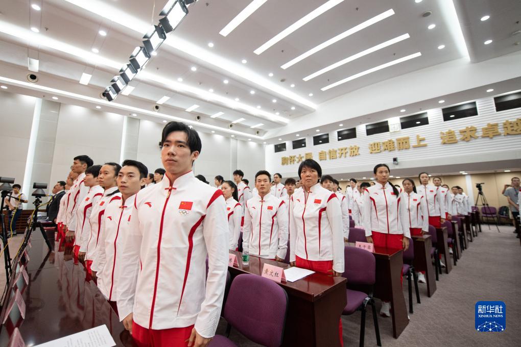 中国体育代表团团部人员以及射击、体操、蹦床、艺术体操、击剑、自行车、田径、花样游泳、跆拳道等项目的参赛运动队代表均在现场参加了会议,其他代表团队伍通过视频参加了会议。