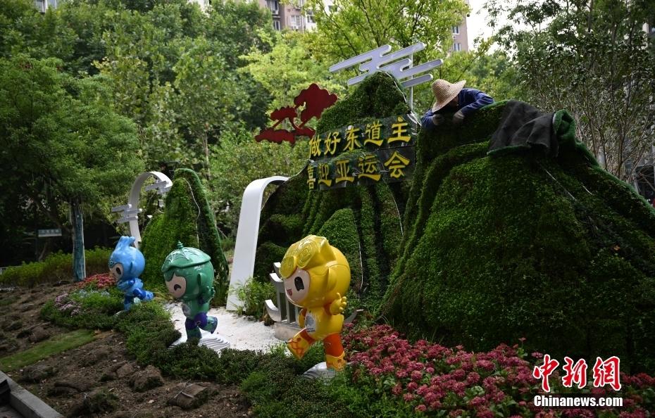 9月12日,浙江杭州,工人在布置杭州亚运会主题绿植景观。随着杭州亚运会临近,亚运元素正深度浸润城市空间和市民生活,沉浸式营造“抬头可见、驻足可观”的亚运氛围。
