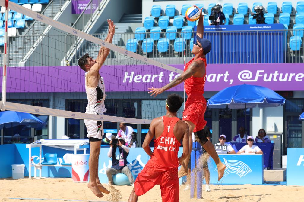 首场比赛为男子预赛,由中国队的王延伟、李杰组合对阵巴勒斯坦队的阿卜杜拉·阿尔坎、易卜拉欣·卡西亚组合。中国队以21:14和21:16连赢两局,迎来中国队本届亚运会比赛首胜。