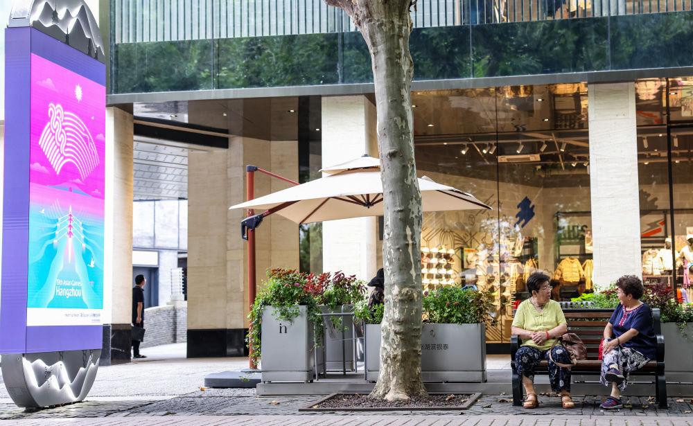 9月20日,市民在亚运会主题标识牌旁的长椅上聊天。新华社记者颜麟蕴 摄