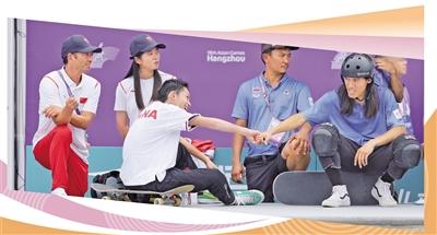 9月25日,泰国代表团选手(前右)向获得滑板项目男子碗池冠军的中国代表团选手陈烨(前左)表示祝贺。记者 蒋雨师摄