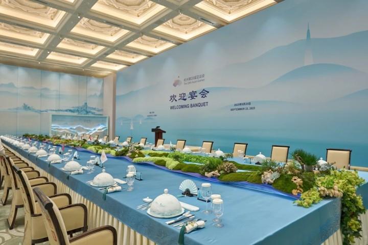 9月23日,在杭州第十九届亚洲运动会开幕式欢迎宴会上,一套国宴餐具全新亮相。摆放于桌面的“钱塘潮涌”国宴餐盘与现场的青绿色基调交相辉映。瓷面上,山河掩映,钱塘潮涌若隐若现,尽显杭州“山水登临之美,人物邑居之繁”。