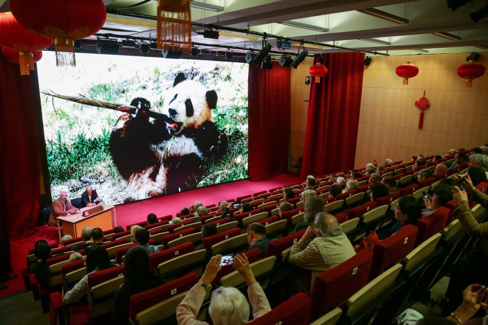 9月28日,比利时天堂动物园创始人兼董事长埃里克·董博(讲台左)在布鲁塞尔中国文化中心举办的“追梦——我的中国故事”讲座中,讲述自己与中国的情缘。(新华社记者郑焕松摄)