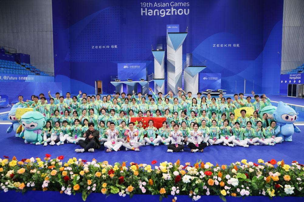 10月8日,在杭州奥体中心游泳馆,志愿者和工作人员在花样游泳比赛结束后合影留念。新华社记者 王楷焱 摄