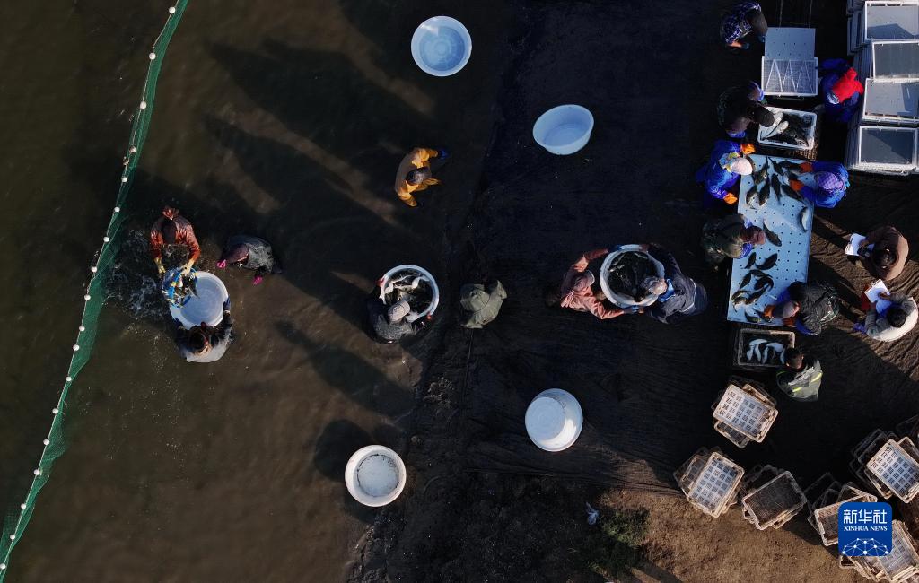 10月11日,唐山市曹妃甸区柳赞镇一家河豚鱼养殖合作社的社员在池塘捕捞河豚鱼(无人机照片)。新华社记者杨世尧摄