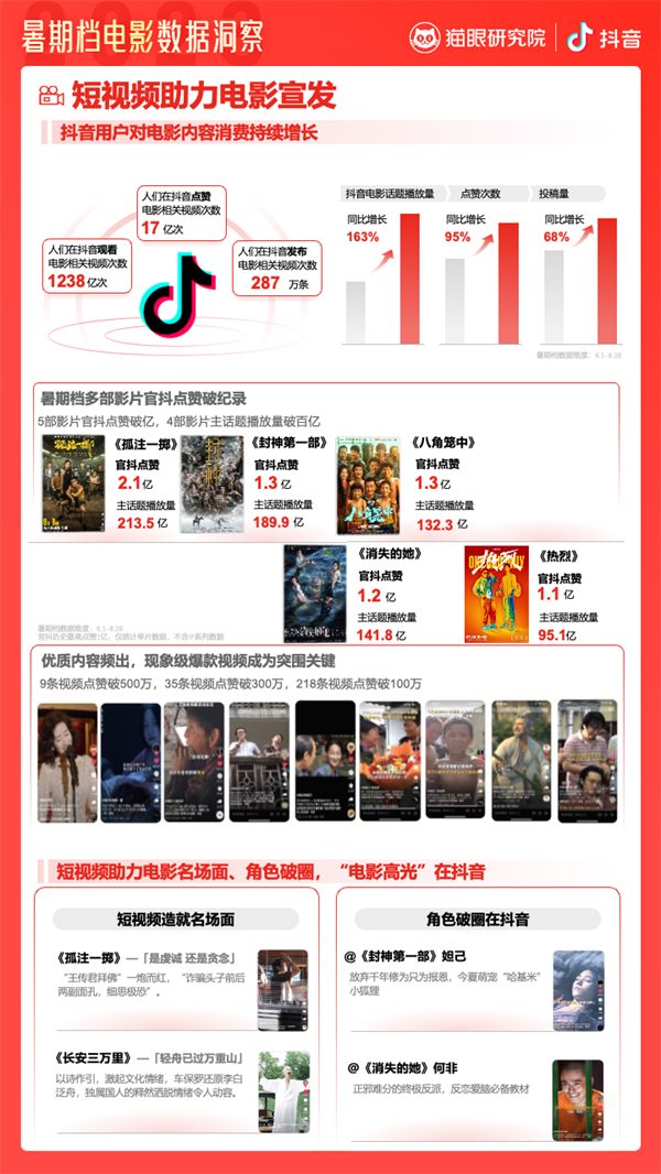 在抖音上,电影内容经过深度解构,推向庞大的观众群体,提高了影视人群的数量,实现了从全民讨论话题到观众购票的高效转化。根据暑期档的数据,电影话题的讨论量和互动量明显增加,抖音上的电影话题播放量同比增长163%,点赞量同比提高95%,投稿量增加了68%。