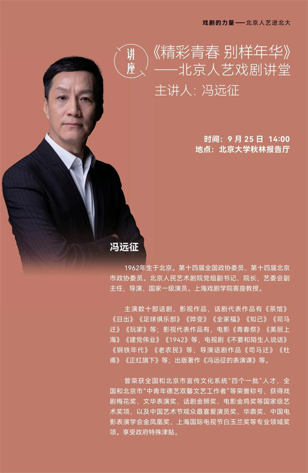 9月25日,北京人艺戏剧讲堂将再次开讲——北京人艺院长冯远征会为北大学子带来一堂题为“精彩青春 别样年华”的艺术讲座,他不仅将与北大学生分享北京人艺的历史发展、艺术风格,还将从青春与人生选择方面,来与大学生分享自己的感悟,梳理自己从青年时代追逐梦想,遭遇挫折但从不放弃努力的人生经历。冯远征希望藉此与年轻人探讨:“青春可以做什么?”“青春就是什么都可以做,摔倒了,拍拍腿站起来,再找一个方向继续向前行。”他希望通过自己的讲座表达这个观点,通过对自己人生经历的分享去鼓励青年学生,敢于追逐自己的梦想。