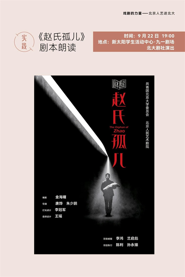 将于9月22日举办的《赵氏孤儿》剧本朗读,是本次活动中大学生参与度最高的活动。“‘京’彩文化·青春绽放”行动计划“文艺行”中,“大团小团手拉手——市属文艺院团与首都高校艺术社团结对共建”是一项重要内容。为此,北京人艺组织优秀导表演专业力量,与北大剧社结对共建,在北大校团委的协助组织下,由北京人艺导演唐烨、朱少鹏指导北大青年学子,进行了一次剧本朗读。北京人艺青年演员王俊淇出演剧中屠岸贾一角,与北大剧社的学生演员共同排演。此次剧本朗读选择了北京人艺前不久刚刚重新排演的剧目《赵氏孤儿》。通过一个半月的排演,不仅让学生们学习体会到了如何展示台词的表现力,更加入了舞台调度,并配合灯光、音响等多种艺术创作手段,力求为观众呈现一场颇有“专业范儿”的交流演出。整个过程中,参与排演的学生提升了对舞台表演的理解,观演的学生则可以提升对戏剧的认知。