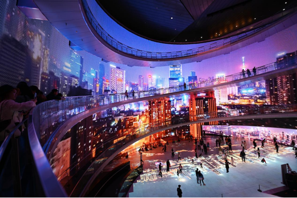 中央圆厅的冬奥遗产展示体验厅,大屏约250平方米,地屏约700平方米,结合1800多平方米的环形屏幕,构成了一个如梦如幻的光影世界。中国电影博物馆专门制作了二十四节气、中国传统节日、特色电影等主题视觉,观众可以在这里切身感受到斗转星移的二十四节气、美好浪漫的七夕、月圆人团圆的中秋佳节、举国同庆的国庆纪念、熠熠生辉的璀璨星河、传统特色的民族电影……让观众沉浸式地感受光影互动带来的乐趣。